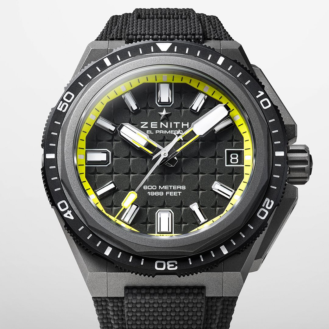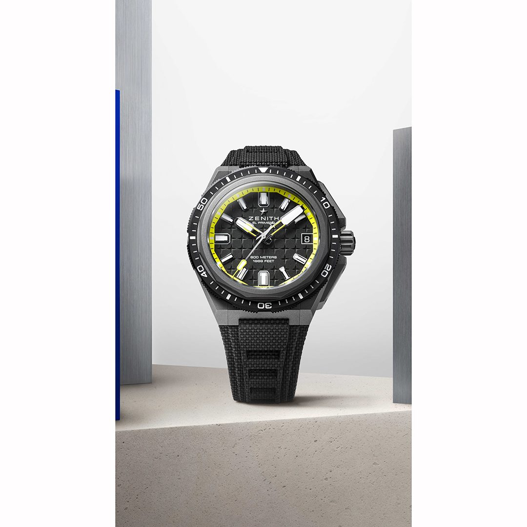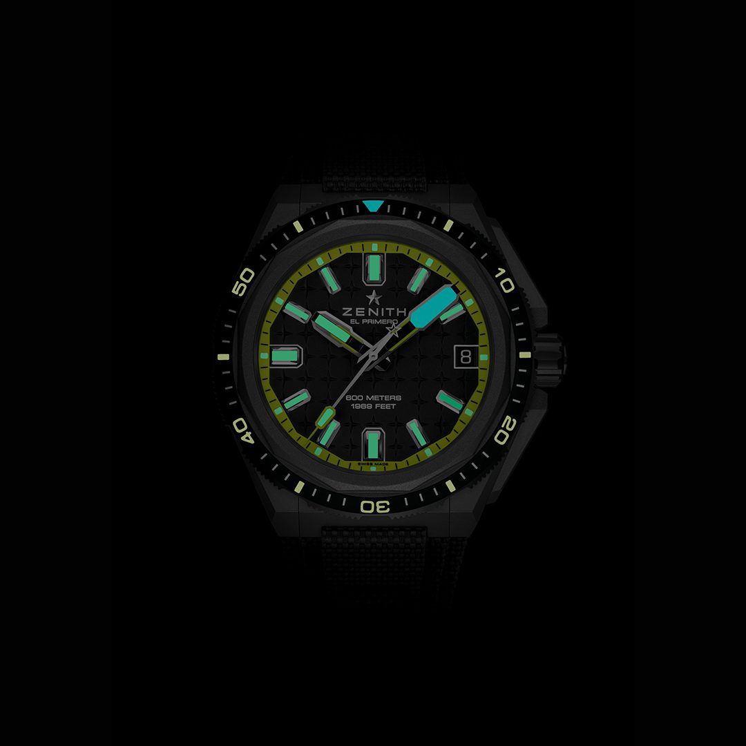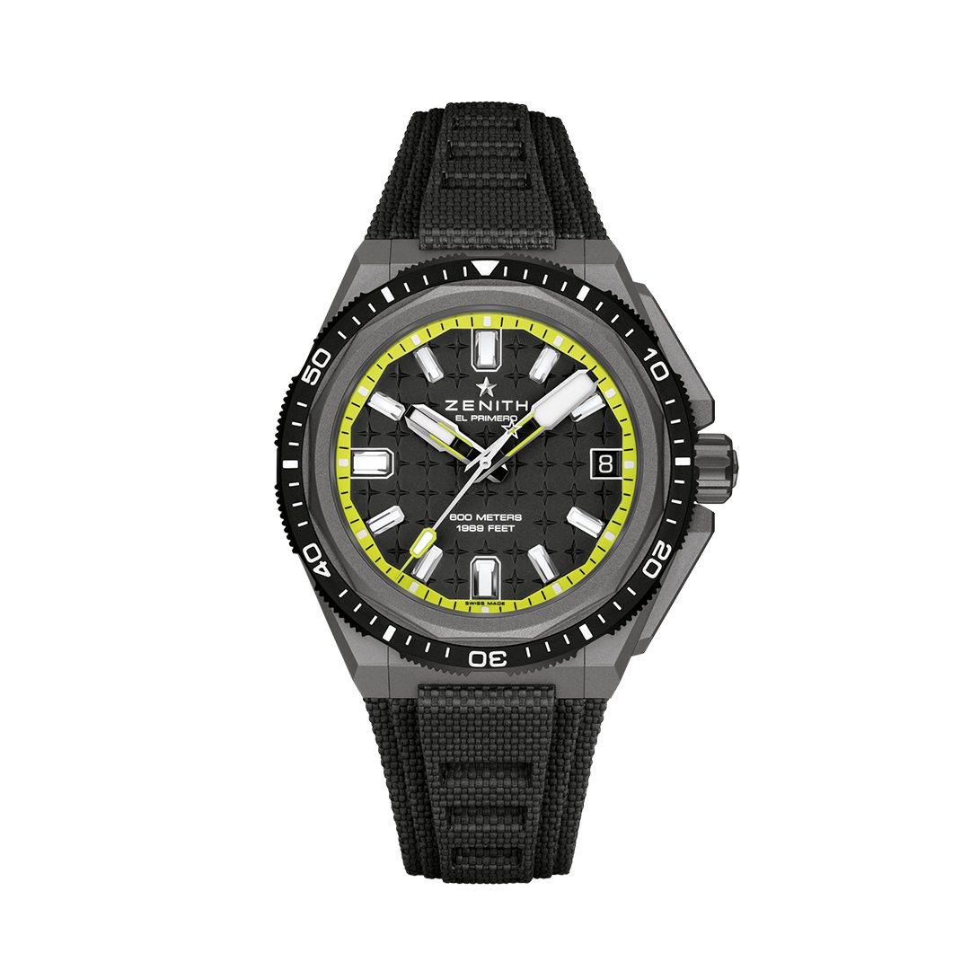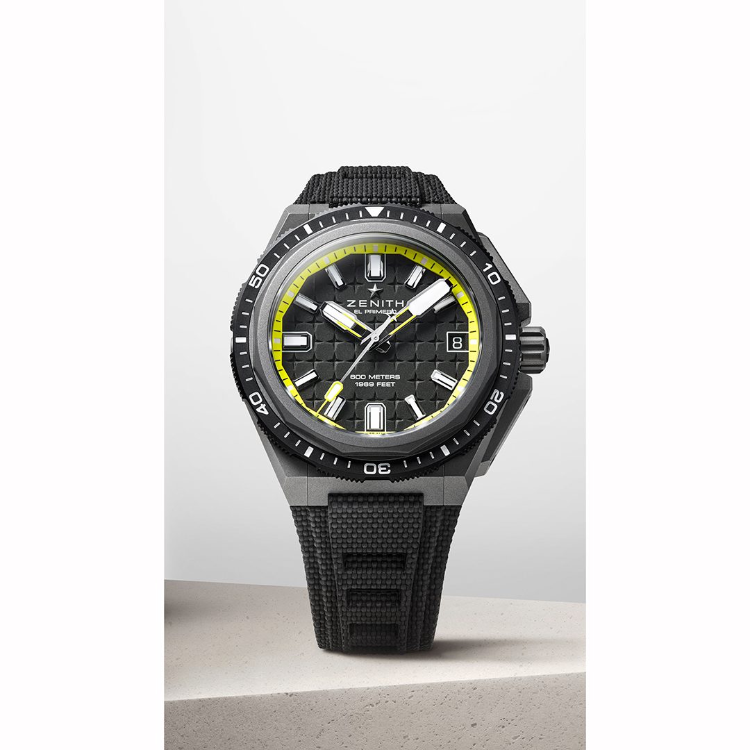 Il Defy Extreme Diver presenta una cassa in titanio microsabbiato da 42,5 mm. Sulla base dodecagonale fissa si trova una lunetta girevole unidirezionale in ceramica nera, interamente riempita di Super-LumiNova. Progettato per le immersioni in saturazione, l’orologio vanta un’impermeabilità fino a 600 metri e presenta una valvola per la fuoriuscita dell’elio, oltre a una corona a vite affiancata da protezioni. Il quadrante nero con motivo a stella è dotato di lancette e indici in Super-LumiNova C1 e punteggiato da accenti giallo acceso. Il fondello trasparente rivela il movimento automatico El Primero 3620. Questo calibro solo tempo batte alla frequenza di 36.000 alternanze l’ora ed è dotato di uno scappamento paramagnetico con componenti chiave in silicio. Il sistema di carica bidirezionale offre una robusta riserva di carica di 60 ore. È dotato di un bracciale a tre maglie in titanio microsabbiato e di due cinturini intercambiabili. Il primo è un resistente cinturino in caucciù nero con texture effetto “Cordura” e fibbia déployante. Il secondo è un cinturino in tessuto monopezzo nero e giallo chiuso da una fibbia ad ardiglione. Il meccanismo integrato di cambio rapido consente di cambiare il cinturino in modo facile e veloce, senza bisogno di attrezzi.