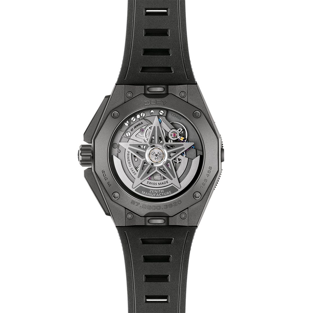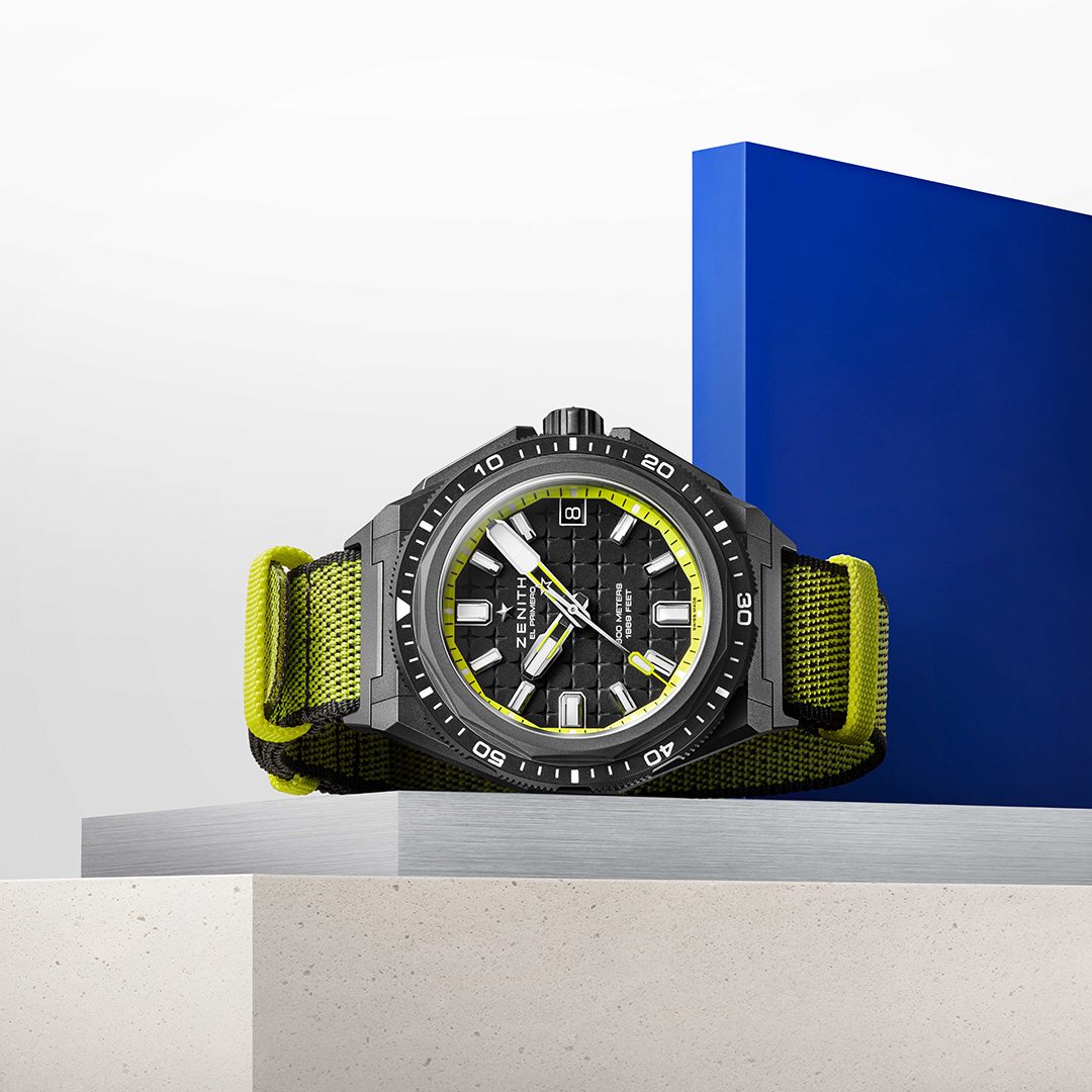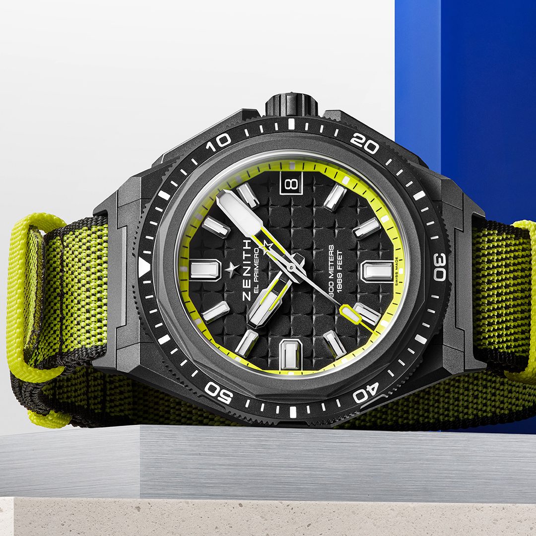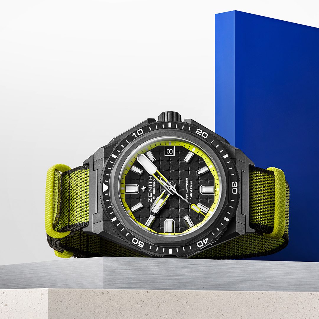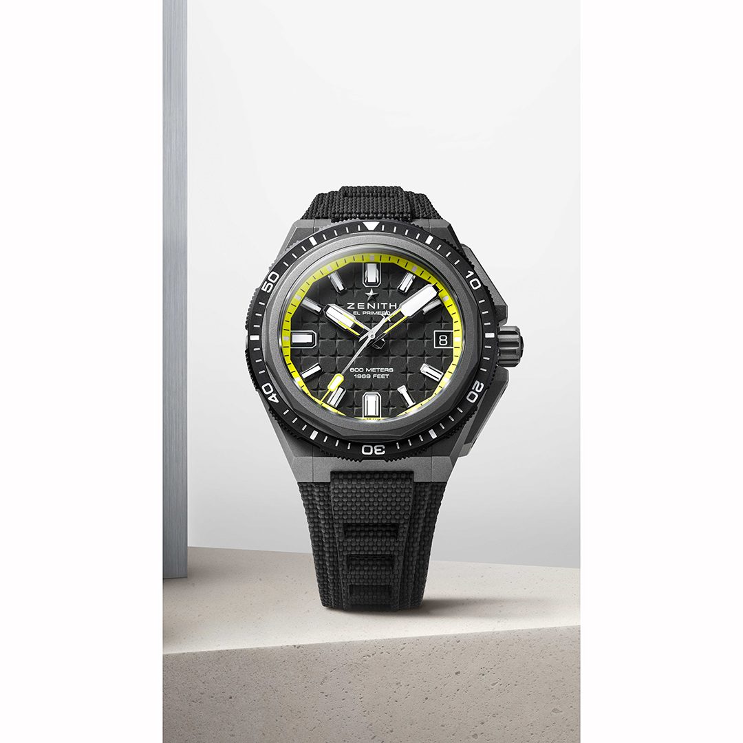 Il Defy Extreme Diver presenta una cassa in titanio microsabbiato da 42,5 mm. Sulla base dodecagonale fissa si trova una lunetta girevole unidirezionale in ceramica nera, interamente riempita di Super-LumiNova. Progettato per le immersioni in saturazione, l’orologio vanta un’impermeabilità fino a 600 metri e presenta una valvola per la fuoriuscita dell’elio, oltre a una corona a vite affiancata da protezioni. Il quadrante nero con motivo a stella è dotato di lancette e indici in Super-LumiNova C1 e punteggiato da accenti giallo acceso. Il fondello trasparente rivela il movimento automatico El Primero 3620. Questo calibro solo tempo batte alla frequenza di 36.000 alternanze l’ora ed è dotato di uno scappamento paramagnetico con componenti chiave in silicio. Il sistema di carica bidirezionale offre una robusta riserva di carica di 60 ore. È dotato di un bracciale a tre maglie in titanio microsabbiato e di due cinturini intercambiabili. Il primo è un resistente cinturino in caucciù nero con texture effetto “Cordura” e fibbia déployante. Il secondo è un cinturino in tessuto monopezzo nero e giallo chiuso da una fibbia ad ardiglione. Il meccanismo integrato di cambio rapido consente di cambiare il cinturino in modo facile e veloce, senza bisogno di attrezzi.