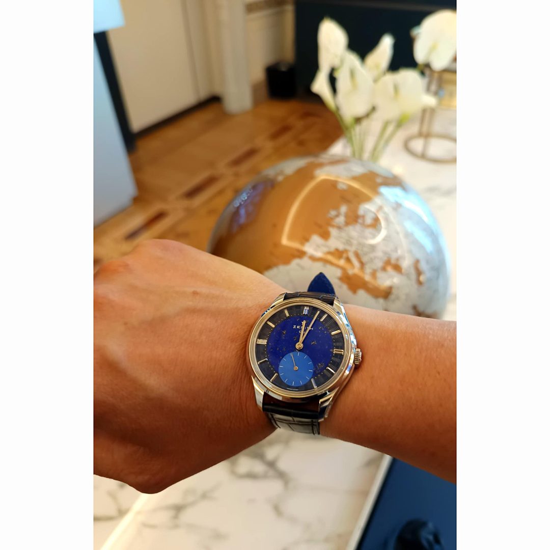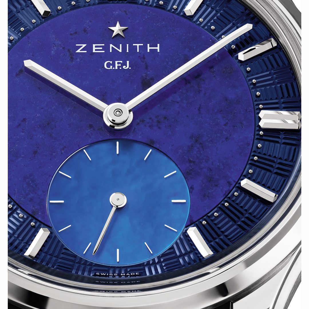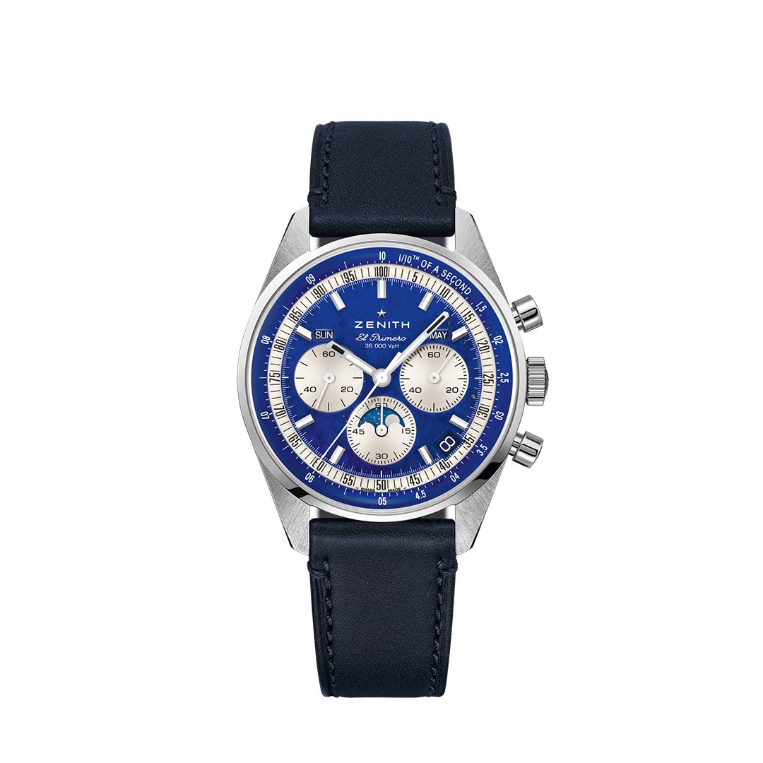 Il secondo indica le ore, la data, il giorno della settimana, il mese e le fasi lunari. Nella nuova versione, il modello presenta un quadrante in lapislazzuli che evoca un cielo notturno stellato con le sue intense sfumature blu costellate di luminosi inserti di pirite color oro. La sua cassa rotonda e compatta da 38 mm trae ispirazione dal modello A386 del 1969, con pulsanti a pompa, anse affusolate e vetro zaffiro bombato. Il cuore di questo orologio è il calibro automatico El Primero 3610. La lancetta dei secondi cronografici compie una rotazione completa in soli 10 secondi, indicando con precisione 1/10 di secondo sulla minuteria argentata. Presenta una riserva di carica di 60 ore e un meccanismo di arresto dei secondi per l’impostazione precisa dell’ora. Il fondello in vetro zaffiro rivela la complessa architettura del movimento, che include una ruota a colonne blu e una massa oscillante scheletrata con la stella a cinque punte. È dotato di un cinturino in pelle di vitello blu con fibbia déployante in acciaio inossidabile e di un bracciale abbinato in acciaio con fibbia déployante.